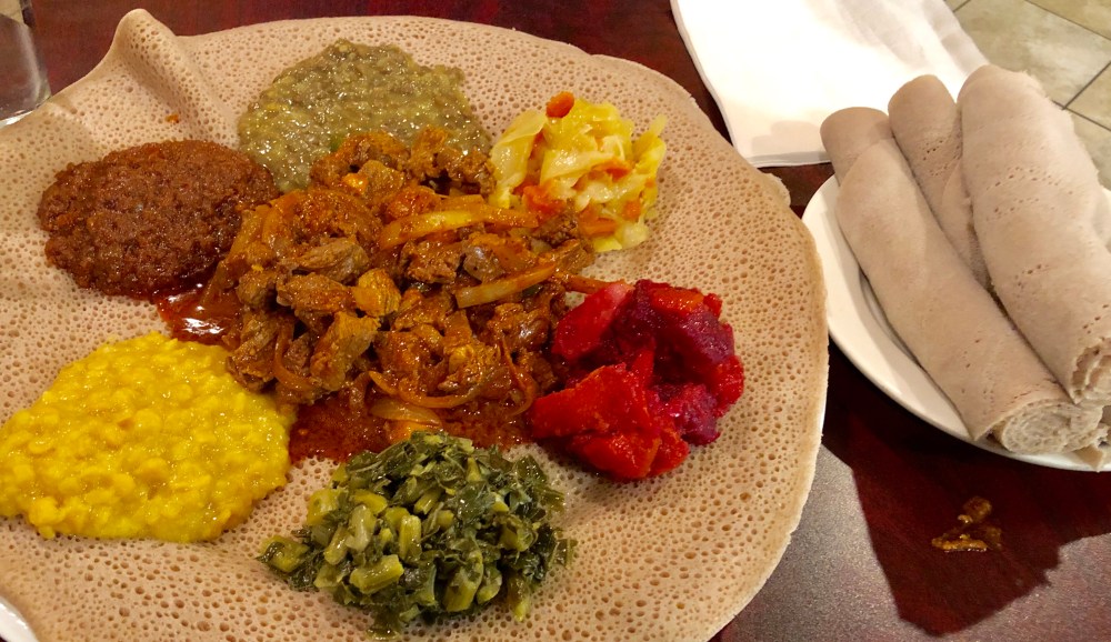 I crowd-sourced what cuisine I should try for the TRY ANOTHER COUNTRY’S CUISINE Challenge and the winner was: Ethiopia! (I took a poll on Facebook and Instagram and Ethiopia thumped Russia/Uzbekistan in the voting). This was one of those challenges where I thought, “Why did I say I’d do this?” We did a little research about what we should eat and, maybe more precisely, what we should avoid. Tibs: stir-fried meat, yes. Kitfo: raw lean ground beef, no. Feeling fairly prepared, we ventured out but I can’t say we were too excited.