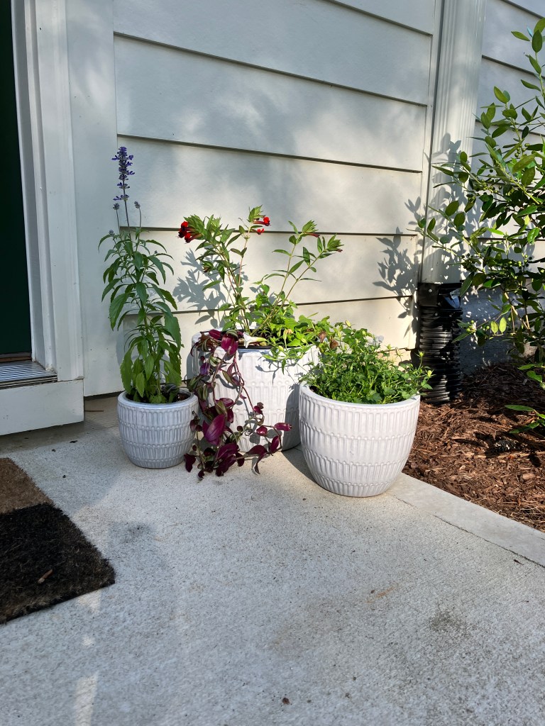 Our townhouse faces west and sits about twenty feet from the woods. I drug Lee with me to For Garden’s Sake, the nearby garden center and we looked for plants with the little signs that said good in partial sun. I picked out four plants to go into three decorative pots we’d purchased earlier. Back home, I was ready. As a dedicated plant mom I’m more comfortable potting plants than I used to be, although I don’t have a great place to work. I’m on the kitchen island and a prayer (that the garbage disposal doesn’t eat any potting soil) plan. Don’t tell Lee.