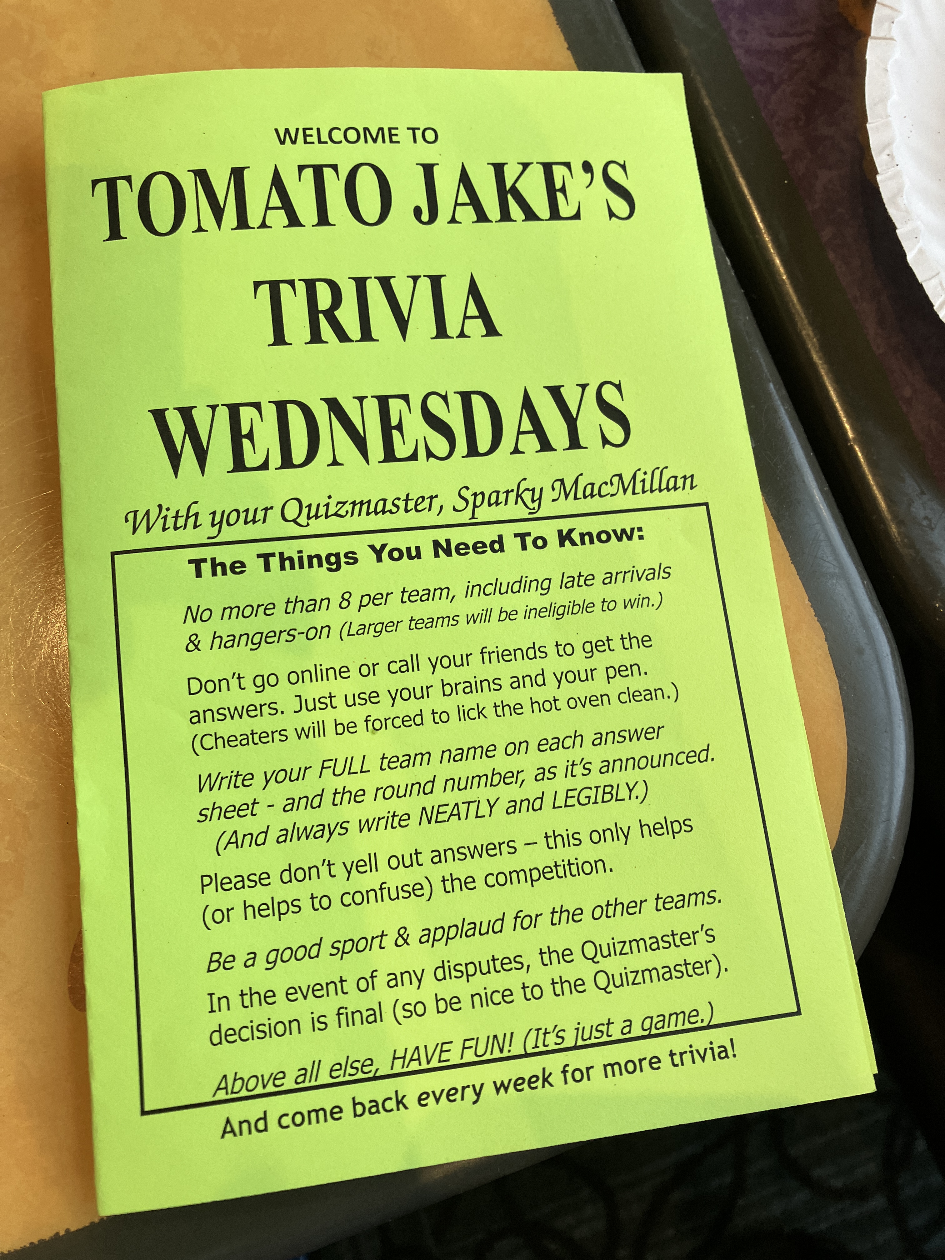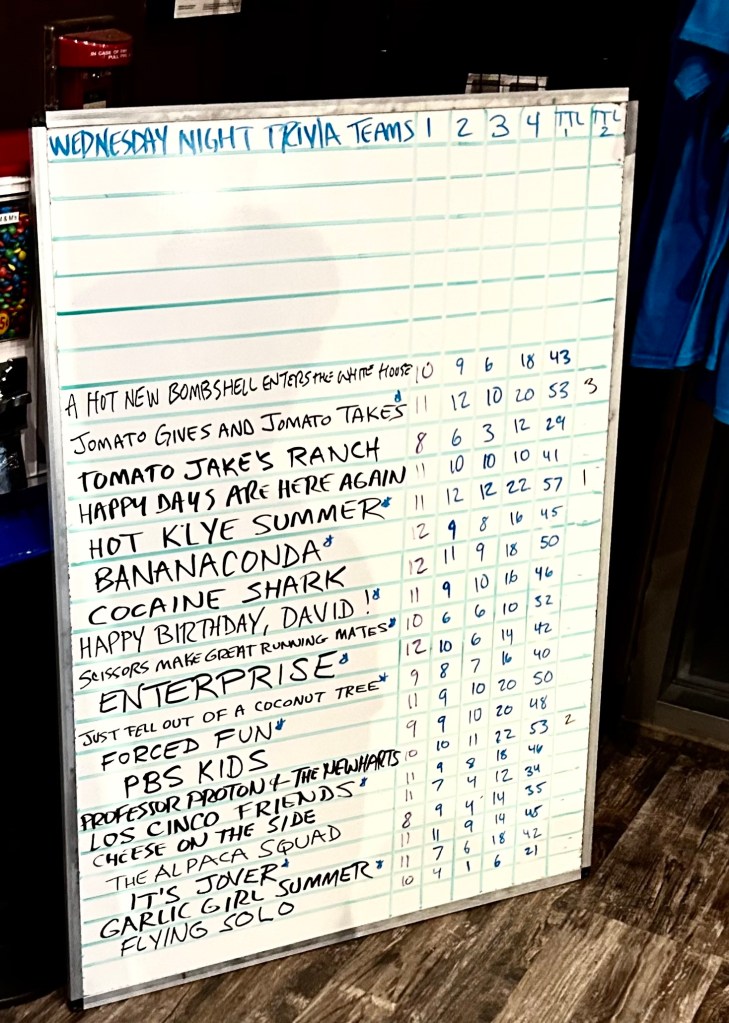 Trivia might be one of the last phone-free spaces. They didn’t confiscate our phones, but Sparky, our quizmaster, was not playing with people looking at their phones. It is the only fair way to play trivia, and it’s also an excellent way to spend undistracted time together.