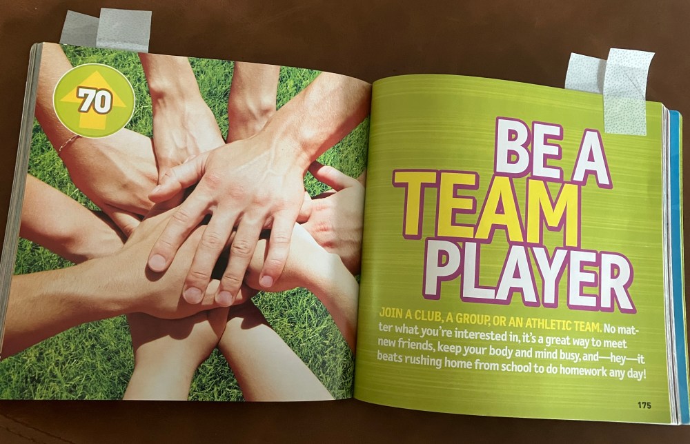 I’ve always been more of an individual sports gal. I started gymnastics when I was 6, maybe 7. As a middle schooler, I ran track. Does cheerleading count as a team sport? Or bowling? I bowled in a league as a 6th grader. 100 Things To Do Before You Grow Up encourages kids to think about groups or clubs, not just athletic teams, so I’ll throw in dance and drama. Alright, already. What are we doing this week? It’s time to BE A TEAM PLAYER.