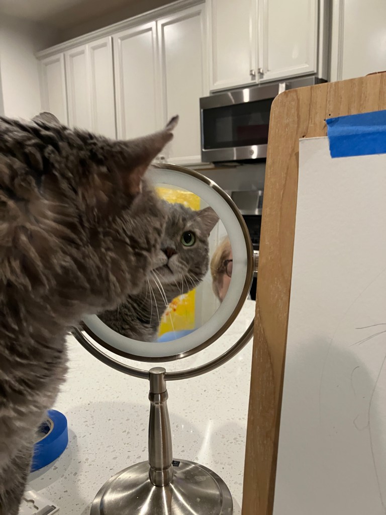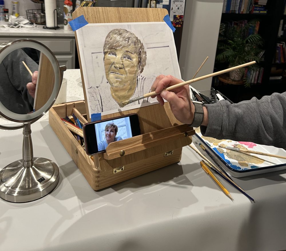 He pulled up the photo on the phone and told me you have to look at the light and dark areas. It took me a minute, but I did see what he meant. Shadows along the jawline, eyes; lighter areas across the upper part of my face and the bridge of my nose. He did offer praise for my paint colors, which I knew could never be recreated. I watched amazed as he gave me a 10-minute class. I knew I could not do what he had just done. No way. It was far from perfect but in 10 minutes, not bad.