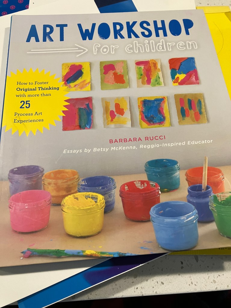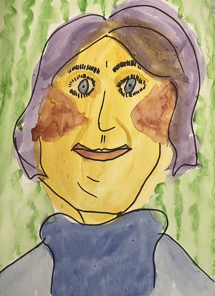 I taped up a new paper, switched from the acrylic paint we’d been using to the watercolors suggested in the book, and tried again. I didn’t worry about colors or likeness; I just had fun. The thing that had felt wrong to me about the printed photos was the earnestness of it all. I was taking myself so seriously and it was obvious to me, and ultimately to Lee, that I wasn’t good at this, and that’s okay. Really, was there some expectation I would be? When I taught preschool, and then later as a Youth Services librarian, I embraced the idea of process art over product art, where the goal is not to recreate something from an example but to explore and have fun. We did our share of product art in the library, to be sure. Here’s a pig puppet, and all the pieces to make him. Often it’s just easier that way, but kids seem to have the most fun when you can just let them create freely. I guess that’s true for me, too.